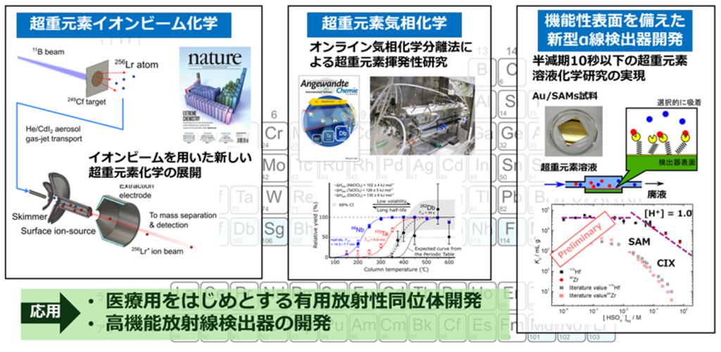 同位体利用化学研究分野では、イオンビーム、気相化学的手法や溶液化学的手法をもちいて、超重元素の化学的性質の解明に取り組むとともに、これらの基礎となる核反応による放射性同位体合成、化学分離法を駆使して、医療用を含む有用放射性同位体の開発や、高機能検出器の開発を進めている。